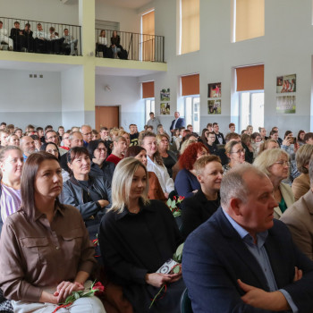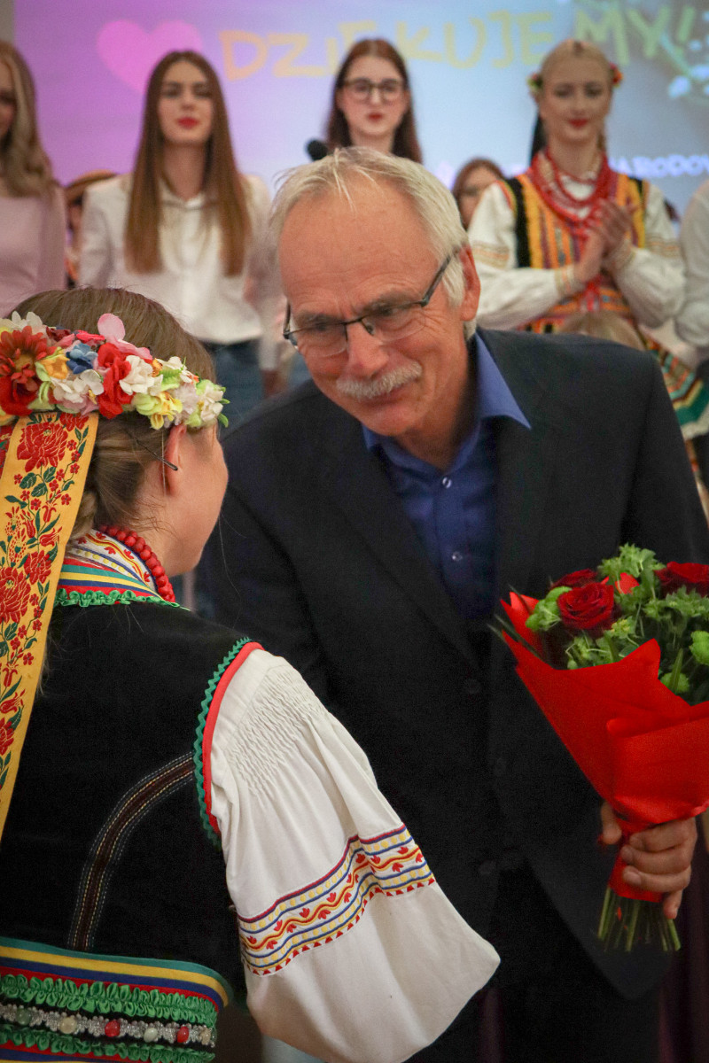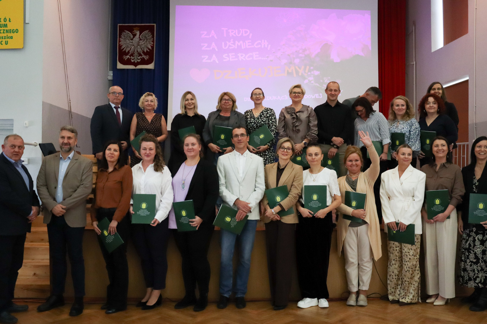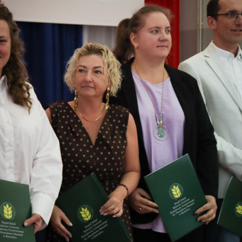 Po zakończeniu części artystycznej dyrekcja nauczyciele oraz społeczność uczniowska gromkimi brawami oraz bukietem kwiatów podziękowała za wieloletnią pracę na stanowisku nauczyciela i kierownika praktycznej nauki panu Bogdanowi Załęskiemu, który w tym roku przeszedł na zasłużoną emeryturę. Nagrodzeni zostali także nauczyciele, którzy w ubiegłym roku szkolnym wyróżniali się w pracy wychowawczeji dydaktycznej.