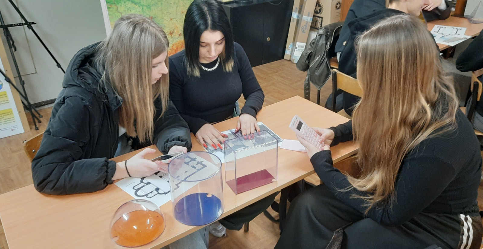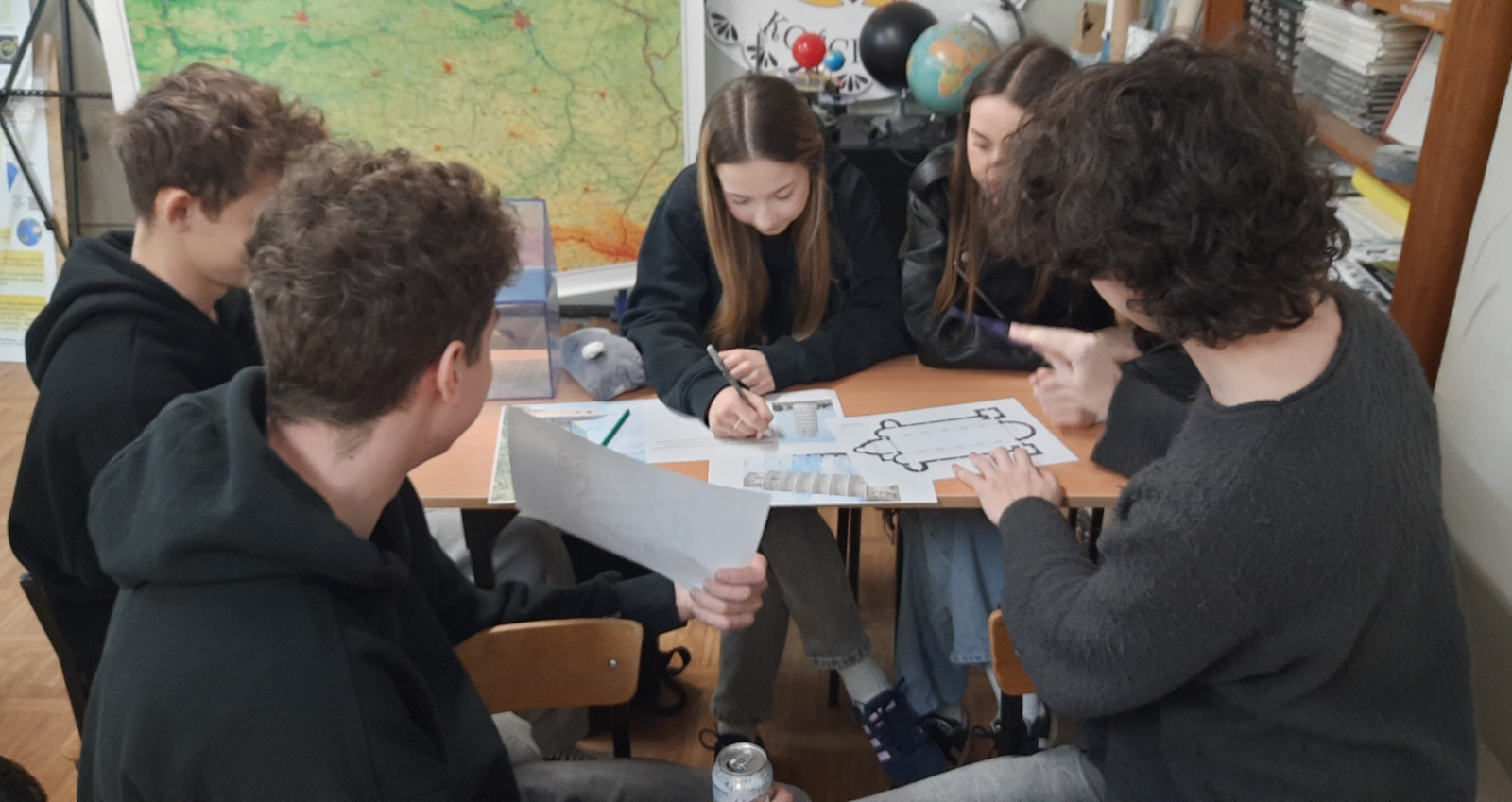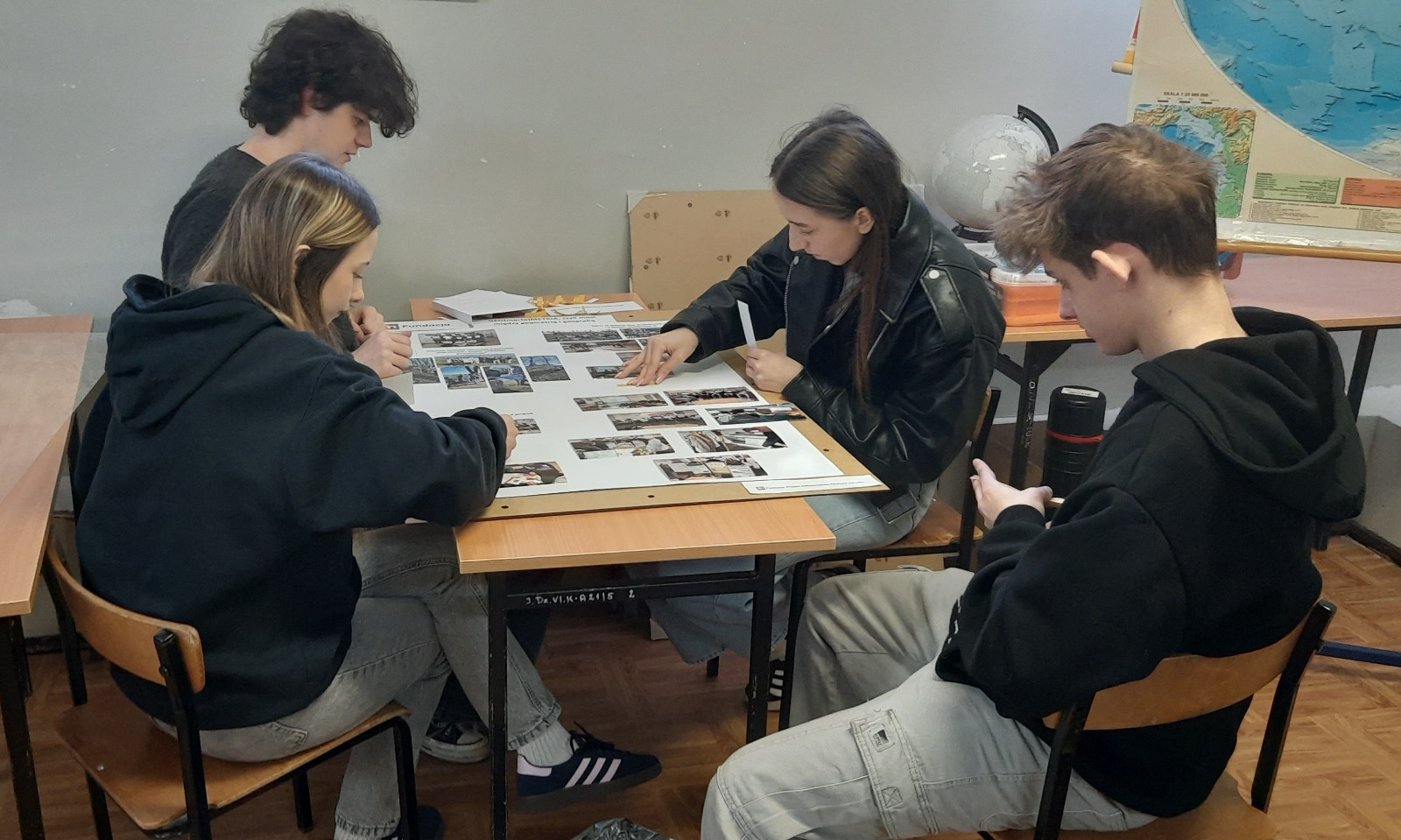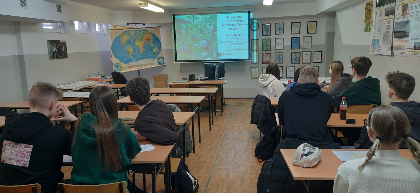 W ramach projektu uczniowie klasy 4TL uczestniczyli w warsztatach z geometrii, prowadzonych przez p. Dorotę Jasińską, oraz w warsztatach z zastosowań geometrii w geografii, prowadzonych przez p. Tomasza Suleję. Podczas zajęć z zastosowań geometrii w geografii uczniowie zaprojektowali i wydrukowali plansze edukacyjne, które będą stanowiły pomoc edukacyjną. Ze środków projektu zakupiono także pomoce dydaktyczne do pracowni matematycznej, m.in. zestaw brył, przyrząd do demonstracji powstawania brył obrotowych czy przyrządy tablicowe. Pomoce te były wykorzystywane podczas warsztatów.